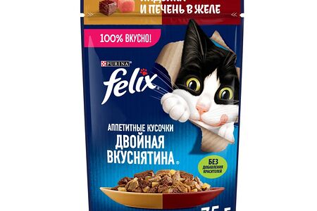 Влажный корм Felix Аппетитные кусочки, Двойная Вкуснятина для взрослых кошек, с индейкой и печенью, в желе 75 г доставка