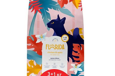Сухой корм Florida для взрослых кошек Курица и яблоко, 3 кг. + 1 кг. доставка