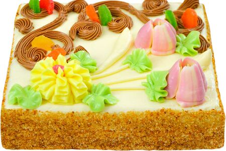 Классический торт из детства! Нежный бисквит пропитан сахарным сиропом и сливочным кремом.Украшен цветами и узорами из сливочного и шоколадного крема и цукатами.