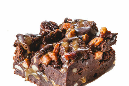 Шоколадный десерт с мягкой карамелью, цельным миндалём, грецким орехом и карамелизированным орехом пекан.