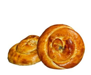 Тонко раскатанное сдобное тесто, свёрнуто в улитку с большим количеством начинки.