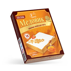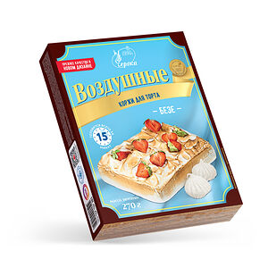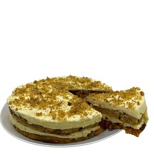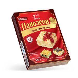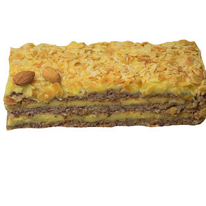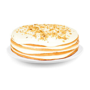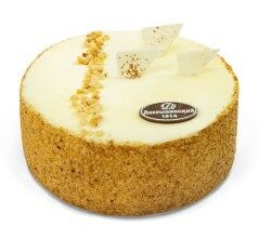 Нежные слои бисквита, соединённые сливочным кремом. Поверхность торта покрыта сливочным кремом, обсыпана ядром дробленного арахиса и сахарной пудрой