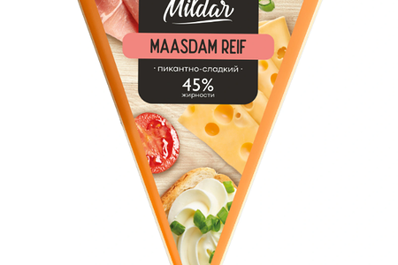 Сыр Maasdam Reif - полутвердый сыр натурального созревания. Сыр желто-золотистого цвета, с большими глазками правильной формы, плотный и маслянистый по своей консистенции. Обладает тонким ореховым ароматом и пикантно-пряным сливочным вкусом. Аромат сыра узнаваемый - острый со сладковато-ореховыми нотками.