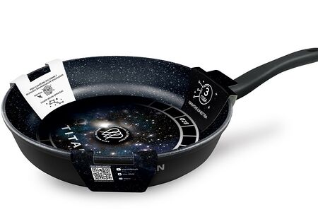 Сковорода НМП Космическая имеет прочный литой корпус, европейский низкий борт,