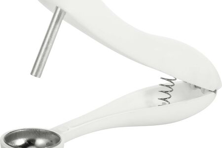 Косточковыдавливатель выполнен из полипропилена. Он состоит из двух полукруглых ложечек с выдавливающим стержнем на одной из них. Позволяет выдавливать косточку из ягоды одним сжатием руки.