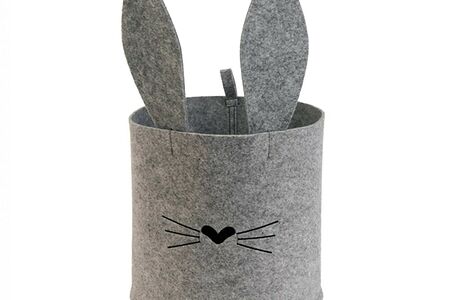 Универсальный органайзер Заяц выполнен из плотного синтетического войлока серого цвета. Это мягкий экологичный материал, приятный на ощупь. Органайзер имеет цилиндрическую форму, украшен аппликацией в виде ушек и вышивкой мордочки зайца.