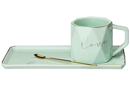 Чайная пара Lefard Break Time «Love» выполнена из фарфора. Она отличается модным мятным цветом, геометрическим рельефом и удобной ручкой. Такой набор станет прекрасным подарком. В комплекте идет ложка, которую нельзя мыть в ПММ и использовать в СВЧ.