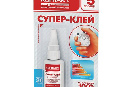 Супер-клей Универсальный КОНТАКТ массой 20 г однокомпонентный моментальный основе этилцианакрилата в флаконе максимального объёма. Колпачок с дозатором надёжно герметизирует, имеет встроенный механизм самоочистки. Колпачок не потеряется, потому что его не нужно снимать - только слегка отвернуть для использования.