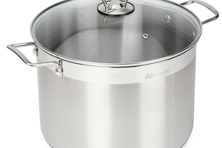 Кастрюля Attribute Master Chef с крышкой большого объема изготовлена из высококачественной нержавеющей стали. Классический дизайн в сочетании с практичной формой делают кастрюлю незаменимым атрибутом на кухне. Крышка из жаропрочного стекла с металлическим ободом плотно прилегает к кастрюле, а пароотвод обеспечивает постоянное испарение лишней влаги. Металлический обод защищает крышку от сколов и внешних повреждений. Толстое пятислойное дно имеет капсульную форму, которая обеспечивает равномерный нагрев, оптимальное накопление и сохранение тепла. Это помогает избежать пригорания пищи в процессе приготовления.