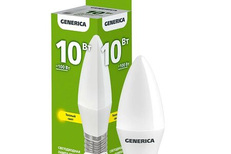 Светодиодная лампа Generica применяется для общего освещения общественных и жилых помещений. Лампа отличается высокой надежностью и экономичностью. Лампа мощностью 10 Вт оснащена цоколем E27. Колба выполнена в форме свечи. Лампочка обладает цветовой температурой 3000К.