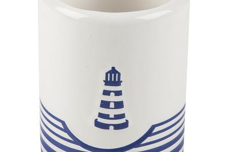 Стакан «Морское путешествие» изготовлен из керамики и предназначен для хранения зубных щеток, пасты и других принадлежностей. Декорирован геометричным принтом и рисунком маяка. Объем — 410 мл.