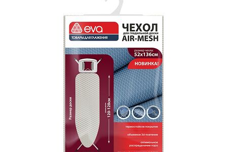 Инновационный чехол Eva Airmesh для гладильной доски является термостойким. Объемное 3D плетение материала обеспечивает оптимальное распределение пара и циркуляции воздуха, что увеличивает скорость и качество глажки. Чехол фиксируется на гладильную доску с помощью затяжного шнура и стопора. Габариты — 136х52 см.