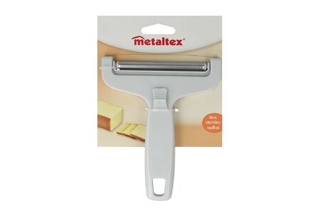 Сырорезка Metaltex выполнена из нержавеющей стали и пластмассы. Удобная ручка не позволит выскользнуть сырорезке из Вашей руки, а благодаря небольшой петле можно подвесить нож на рейлинге. На ручке имеется кнопка-регулятор, с помощью которой Вы сможете отрегулировать толщину желаемого ломтика.