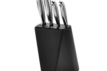 Ножи TalleR Блэксмит выполнены из твердой коррозионностойкой стали. Узор на облегченных рукоятках создает небольшую ребристую поверхность, приятную на ощупь. Деревянная подставка в черном цвете с пластиковой накладкой сверху для предотвращения появления порезов на дереве.