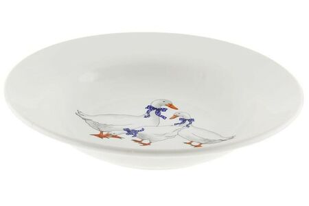 Материал изготовления суповой тарелки Гуси -- фарфор. Фарфор экологически чист и химически нейтрален, он не вступает ни в какие реакции, не окисляется, легко моется и не требует особых условий хранения, устойчивость к интенсивным нагрузкам, жаропрочный, термостойкий.