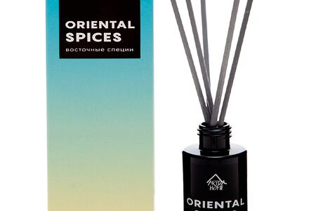 Ароматический диффузор Восточные специи — это самый простой, изящный, эффективный и долговременный способ ароматизации пространства, набирающий свою популярность во всем мире день ото дня. Изделие представляет собою изящную стеклянную емкость 50 мл с ароматной жидкостью. В комплекте идут несколько длинных фибровых палочек, которые вставляются в диффузор. Данный аксессуар отлично впишется в любой интерьер.