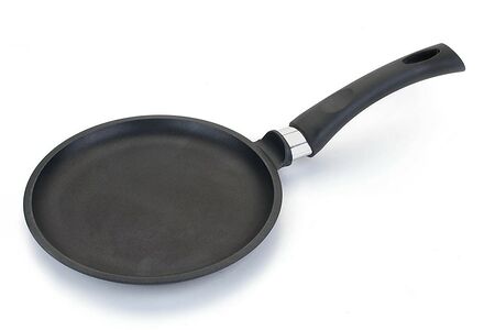Блинная сковорода НМП изготовлена из литого алюминия. Она имеет низкий борт и удобную ручку, благодаря чему легко переворачивать и снимать блины. Утолщенное дно обеспечивает особые термоаккумулирующие свойства: блин равномерно пропекается по всей толщине и красиво румянится с обеих сторон.