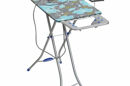 Доска оборудована подставкой под утюг с термостойкими силиконовыми заклепками, которая предназначена специально для утюгов с тефлоновым покрытием. Кроме того, у доски есть съемный подрукавник и электроудлинитель. Всего можно установить два положения высоты: 0.7 и 0.8 м.