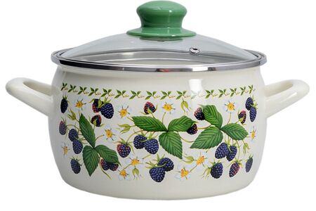 Кастрюля Metrot Ежевика обладает эмалированным покрытием. Она декорирована ярким рисунком и оборудована стеклянной крышкой. Такая кастрюля подходит для любых типов плит. Можно мыть в посудомоечной машине.