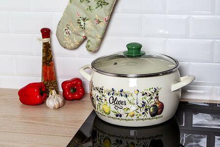 Кастрюля с крышкой Metrot Олива обладает эмалированным покрытием. Она декорирована ярким рисунком и дополнена стеклянной крышкой. Кастрюля подходит для любых типов плит. Можно мыть в посудомоечной машине.