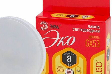 Лампа мощностью 8 Вт оснащена цоколем типа GX53. Колба выполнена в форме таблетки. Такая лампочка обеспечивает стабильный теплый свет без мерцания. Она мгновенно включается и не нагревается.