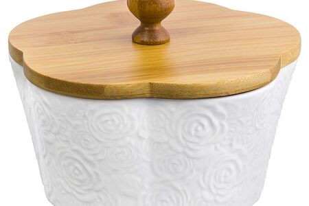 Банка для печенья Розы с деревянной крышкой выполнена из высококачественного фарфора, а крышка — из натурального бамбука. Теплое цветовое решение и изящная форма подходит любой сервировке и добавит уюта в каждый дом. Банку можно использовать для печенья, конфет и других сладостей.