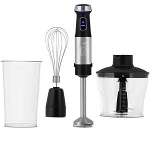 В комплекте с миксером — хромированные насадки-венчики для взбивания и насадки-крюки для замешивания теста: они отсоединяются от прибора простым нажатием специальной кнопки. Мощность — 300 Вт.