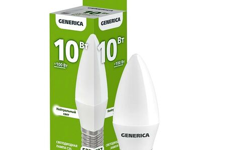 Светодиодная лампа Generica применяется для общего освещения общественных и жилых помещений. Лампа отличается высокой надежностью и экономичностью. Лампа мощностью 10 Вт оснащена цоколем E27. Колба выполнена в форме свечи. Лампочка обладает цветовой температурой 4000К.