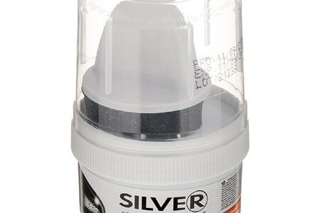 Черный крем-блеск для обуви Silver с губкой прекрасно защитит вашу обувь от загрязнений. Формула на основе натурального воска защищает, придает кожи эластичность и блеск всем видам кожаной обуви. Просто нанесите на очищенную и сухую поверхность обуви тонким слоем. Объем — 50 мл.