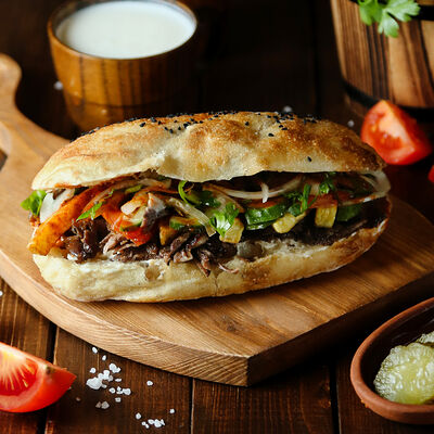 Сочная говядина в фирменном маринаде, обжаренная на гриле, свежие сочные томаты, свежие огурцы, молодая капуста в соусе от шефа на основе кефира в лаваше