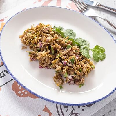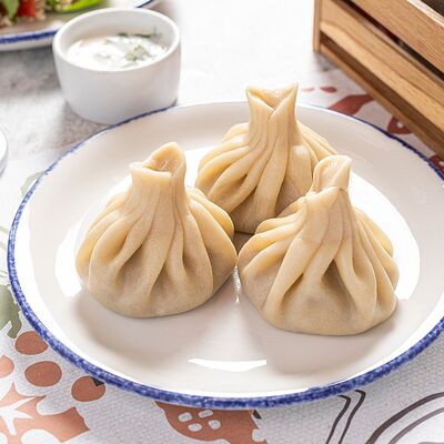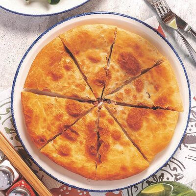Тонко раскатанное тесто с начинкой из сыра Сулугуни и свежей зелени (укроп, петрушка, щавель, шпинат, зелёный лук и кинза)