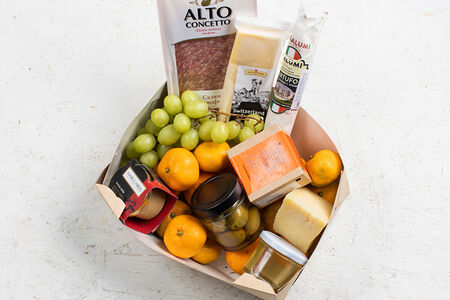 Сведения о составе: сыр Швейцарский, сыр Пармезан, оливки Халкидики с косточкой, паштет из утиной печени, салями с трюфелем, колбаса Фуэт классическая, сыр Камамбер тройные сливки, мёд, мандарины, виноград. Состав коробки может измениться.