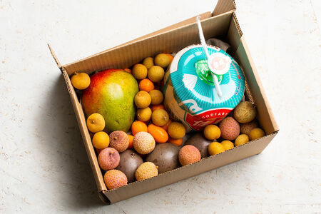 Сведения о составе: кокос молодой с трубочкой, гранадилла, физалис, маракуйя, кумкват, манго Королевское. Состав коробки может измениться.