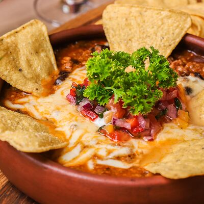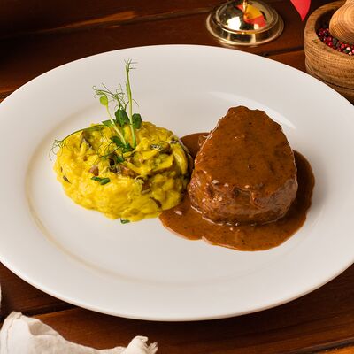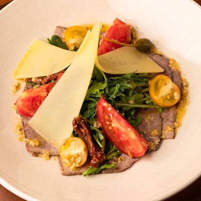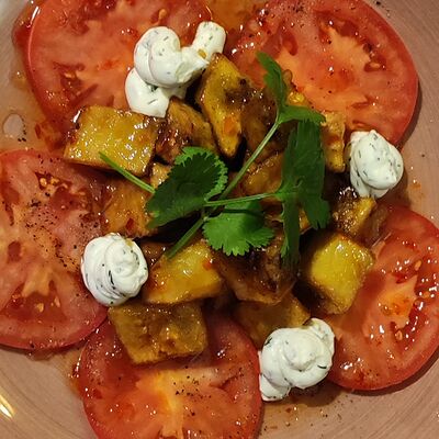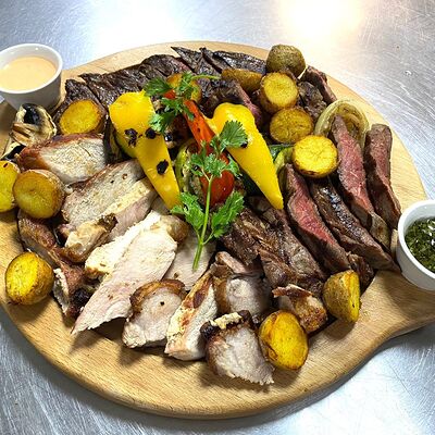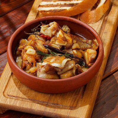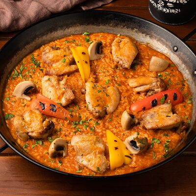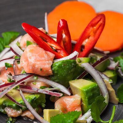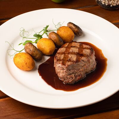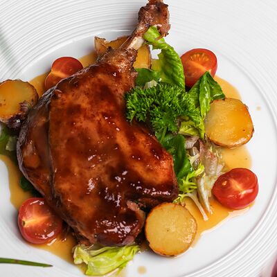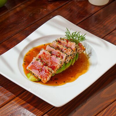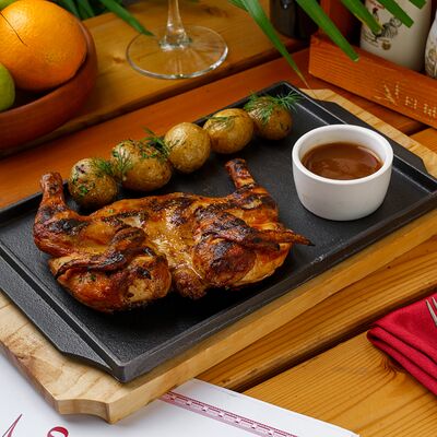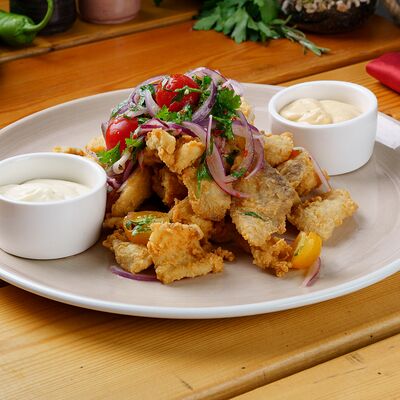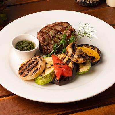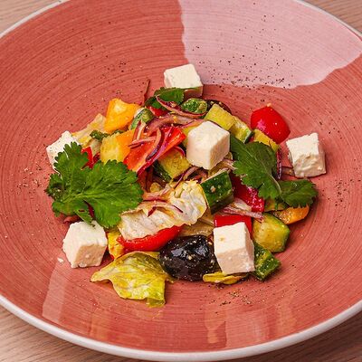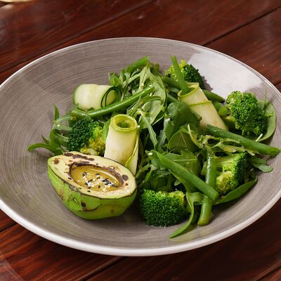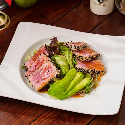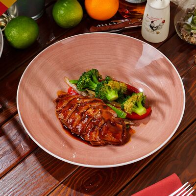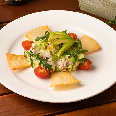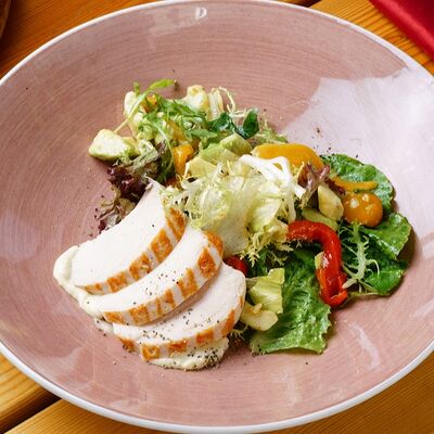 Обжаренное филе куриной грудки, маринованное в оливковом масле с хересным уксусом и пряными травами, подается с микс-салатом, авокадо и фруктовым соусом айоли