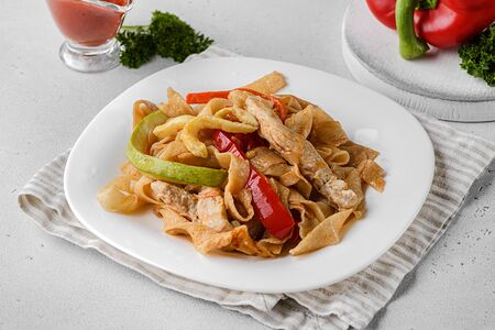 Лапша, куриное филе, перец болгарский, кабачки, лук, морковь, зелень