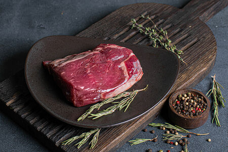 Сочный мраморный стейк «Рамп» обладает насыщенным вкусом, нежной текстурой. Отлично подходит для приготовления на сковороде или гриле. Продолжительность зернового откорма — 150 дней. Мраморность — «Топ Чойс».