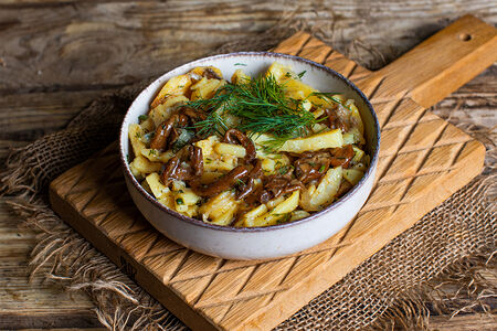 Предлагаем попробовать жареный картофель с грибами от нашей кулинарии, приготовленное из отборных натуральных ингредиентов: молодой картофель, опята, лук репчатый, растительное масло, укроп, соль морская, перец черный молотый.