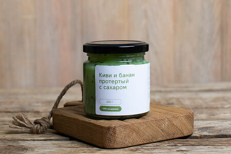 Экзотический десерт из киви и банана, протертых с сахаром, сладкий с выраженной кислинкой. Лакомство станет прекрасным дополнением для завтрака: его можно добавлять в творог или намазывать на тосты. Благодаря щадящей обработке, консервация получается довольно полезной, так как в ней сохраняется большая часть витаминов и микроэлементов.