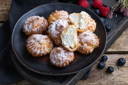 Попробуйте профитроли с нежнейшим сливочно-сырным кремом. Пирожные изготавливаются вручную с любовью и заботой о качестве в нашем кондитерском цехе. В составе только натуральные продукты из ближайших ферм.
