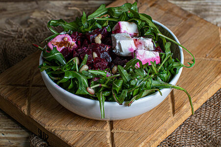 Салат с запечённой свёклой и сыром Фета с добавлением полезной руколы и кедровых орехов — отличный вариант правильного и сытного перекуса.