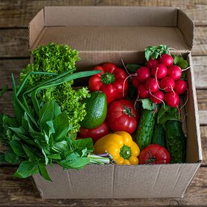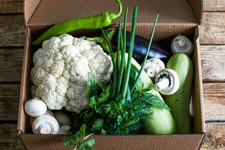 Коробка натуральных, свежих овощей состоит из кабачков, цветной капусты, баклажанов, болгарского перца, шампиньонов, зеленого острого перца и букета зелени. Отлично подойдет для приготовления первых и вторых блюд, салатов.