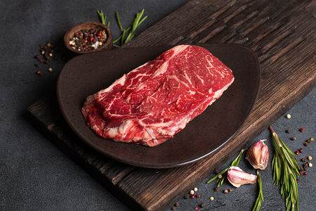 Рибай – звезда классических стейков, узнаваемый во всем мире. Отруб нарезают из толстого края спинной части. В этом месте нет двигательных мышц, и мясо сохраняет восхитительную нежность и мягкость. Множество тонких жировых прожилок придает отрубу изысканную мраморность. Жир топится во время жарки, проникая в мякоть, что обеспечивает невероятную сочность стейку.