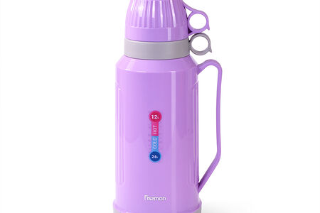 Представляем термос объемом 1800 мл с колбой из прочного белого стекла и двойными вакуумными стенками. Этот стильный термос фиолетового цвета идеально подойдет для хранения и транспортировки чая, кофе и различных напитков.