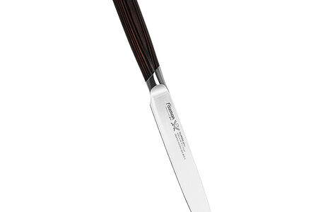 "Элегантная рукоять из материала Pakka Wood имеет элегантную форму и обеспечивает надёжный захват. Изготовленные по особой технологии, без единой заклепки, они очень удобны и эргономичны. Ножи безупречно сбалансированы и хорошо лежат в руке.