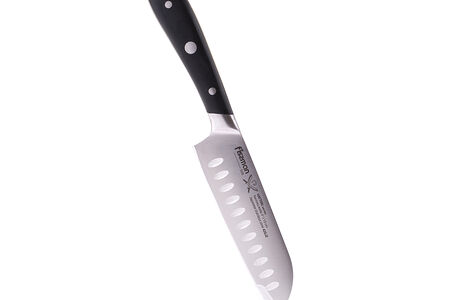 Нож Сантоку - многофункциональное изделие. Предназначено для шинковки овощей, тонкой нарезки, разделки мяса и рыбы. Углубления на поверхности облегчают использование: в них при нарезке остается воздух, поэтому продукты не налипают на лезвие.