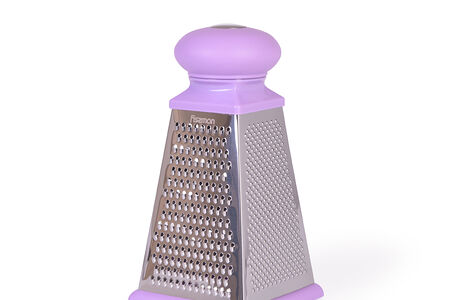 Лезвия выполнены из качественной нержавеющей стали, обладающей антикоррозийными свойствами. Качественная заточка лезвий поможет вам натереть, нашинковать овощи и фрукты без особого труда. • Терка имеет 4 поверхности: для натирания пюре, крупной и мелкой соломки, ломтиков. • Основание терки имеет съемную вставку из силикона, благодаря чему изделие не скользит по поверхности стола. • Конусная форма терки гарантирует ее устойчивость при использовании. • Сверху на терке находится удобная ручка эргономичной формы. • Простота в использовании и легкость в уходе.