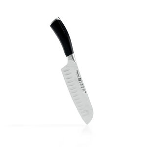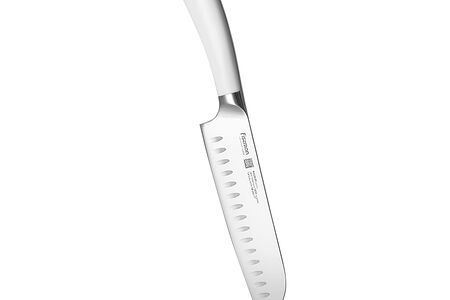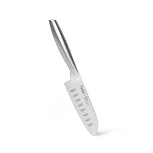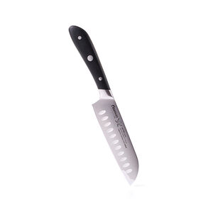 Нож Сантоку предназначен для шинковки овощей, тонкой нарезки, разделки мяса и рыбы. Углубления на поверхности облегчают использование: в них при нарезке остается воздух, поэтому продукты не налипают на лезвие.