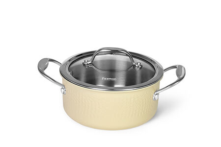 Новая серия BRIGITTE – результат труда дизайнеров и технологов компании FISSMAN. Сложное и уникальное производство позволило соединить два материала в одно произведение искусства и представить серию, которой нет аналогов. Посуда серии BRIGITTE имеет 2 слоя – высококачественная нержавеющая сталь 18/10 (INOX304) внутри и алюминиевый слой с термостойким покрытием HAMMER оригинального кремового цвета снаружи. Оптимально подобранная толщина слоёв обеспечивает быстрый и равномерный нагрев от конфорок плиты любого типа, включая индукционную. • Двойной корпус (высококачественная нержавеющая сталь 18/10 (INOX304) внутри и алюминиевый слой снаружи) • Термостойким покрытием HAMMER оригинального кремового цвета снаружи • Многослойное индукционное литое дно для оптимального распределения тепла • Мерная шкала (для контроля количества жидкости) • Прозрачная ударопрочная стеклянная крышка с паровыпуском позволяет наблюдать за готовностью пищи, не открывая посуду, тем самым, исключая попадания брызг на кожу и одежду • Удобные элегантные литые стальные ручки на заклепках • Стильный, оригинальный дизайн • Наивысший стандарт качества • Энергосбережение • Одобрено профессионалами • Безопасно для здоровья и окружающей среды