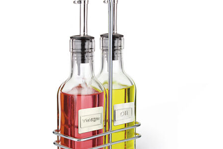 На кухне имеет значение каждая деталь – от этого зависит и порядок, и комфорт. Соус, масло или уксус – любую заправку удобнее наливать из специальной посуды. Для этих целей компания FISSMAN предлагает использовать набор на подставке, состоящий из двух бутылочек для масла и уксуса с дозатором. Набор обладает рядом преимуществ: • Корпус бутылочек изготовлен из высококачественного стекла устойчивого к механическим повреждениям, носик с крышкой из нержавеющей стали обладают коррозийной стойкостью • Благодаря дозатору можно быстро налить необходимое количество масла или уксуса, а жидкость не будет течь по горлышку и оставлять пятна на поверхностях • Изящная хромированная подставка удобна для переноски и сервировки стола • Экологичность – не впитывает запахи, сохраняет содержимое свежим надолго • Не вступает в химическую реакцию с продуктами и не выделяет вредных веществ • Безопасно для здоровья и окружающей среды
