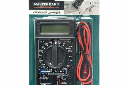 Мультиметр цифровой, Master Hand, предназначен для использования в хозяйственно-бытовых целях. Основным назначением является измерение характеристик электрического сигнала. В набор входит батарейка 6F22 (9V). Перед использованием внимательно ознакомьтесь с инструкцией и мерами предосторожности на упаковке. Напряжение: 9 В. Напряжение постоянного тока: 200 мВ-1000 В. Напряжение переменного тока: 200 В-750 В. Постоянный ток: 200 мА-10 А. Сопротивление: 200 Ом -2000 КОм.